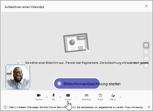 Sie können Dinge aufzeichnen, die auf Ihrem Bildschirm passieren, z. B. exemplarische Vorgehensweisen und Präsentationen, und sie als Videoclip an einen Chat oder Kanal senden.