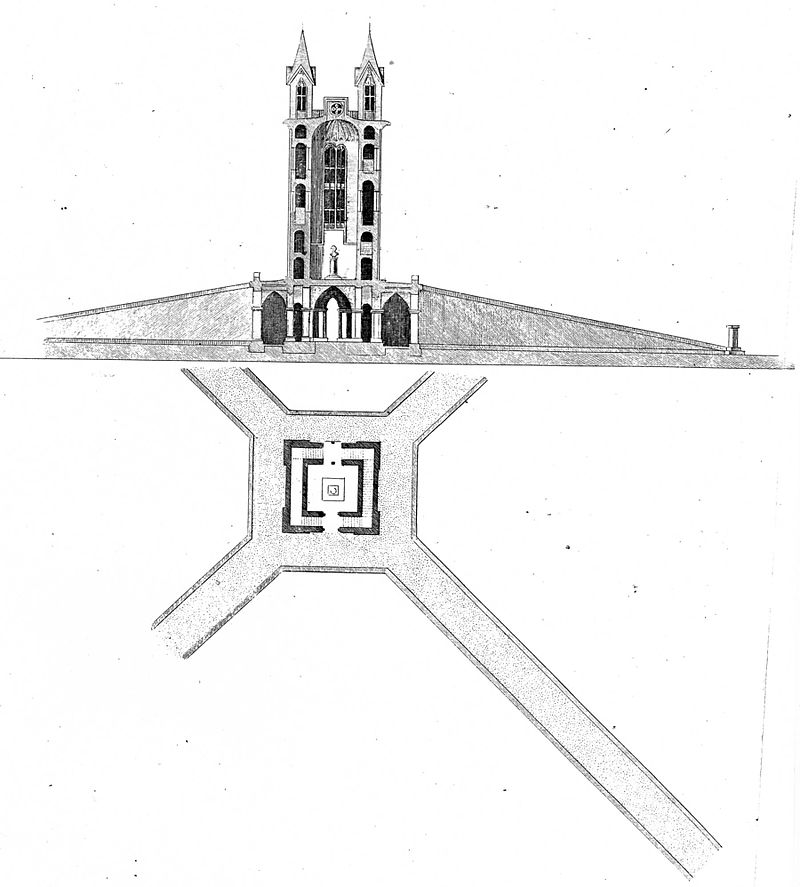 zweigeschossigen quadratischen Turm von acht Meter Seitenlänge und 20 Meter