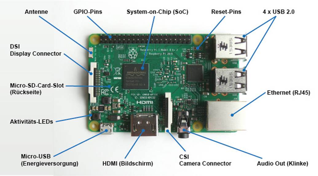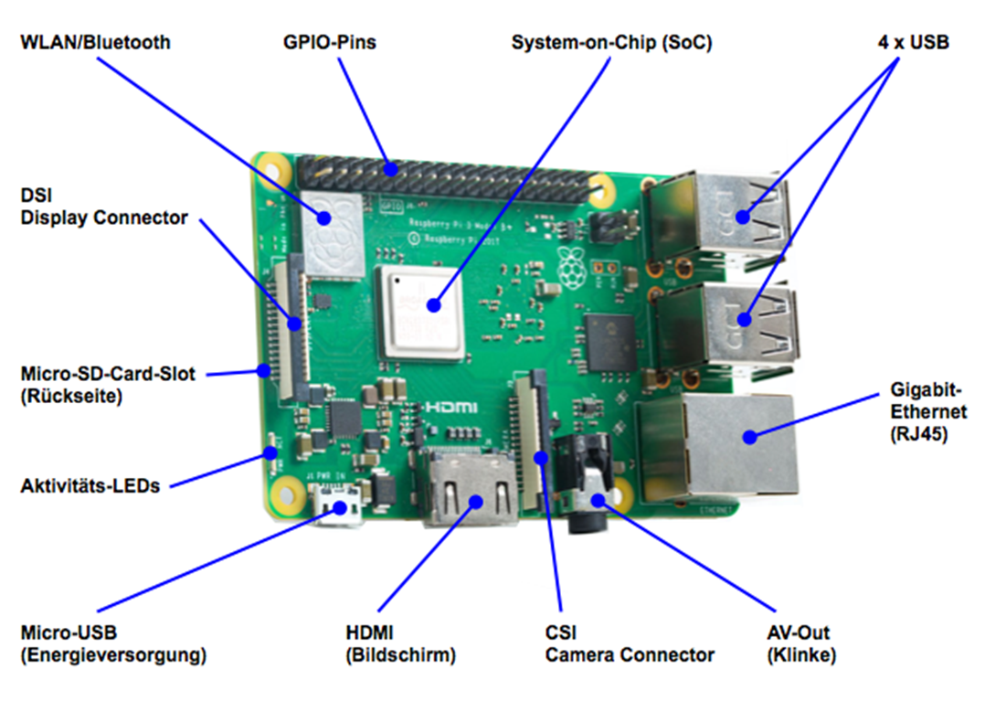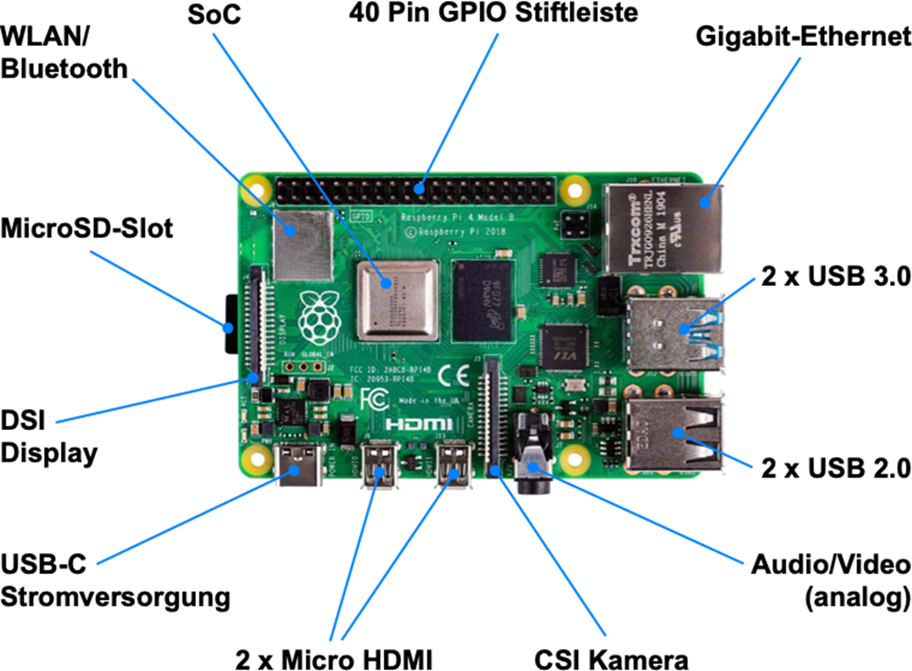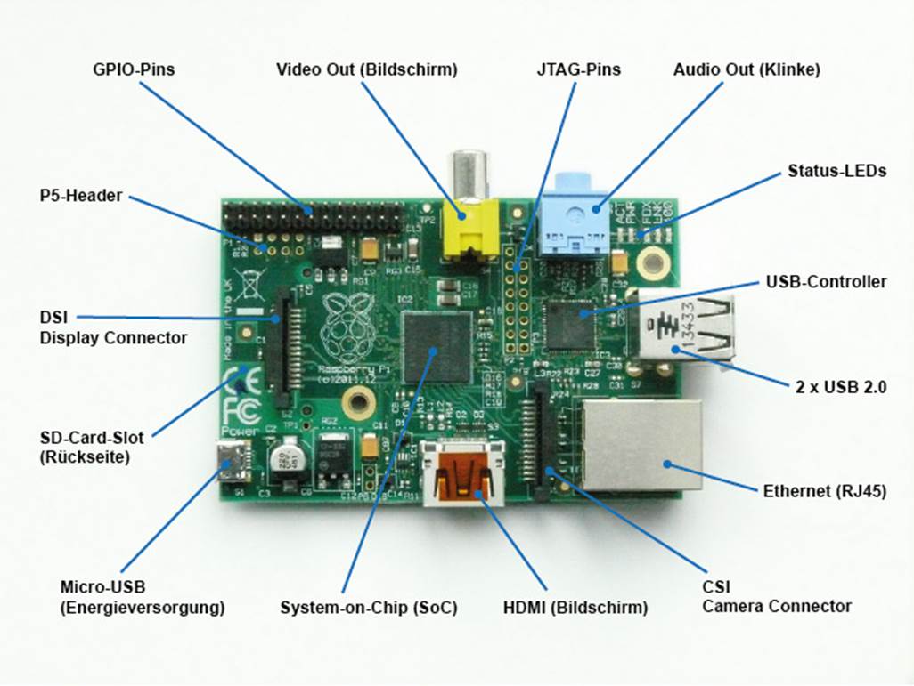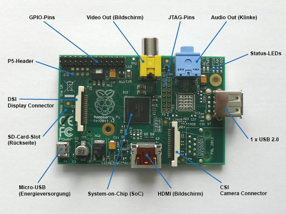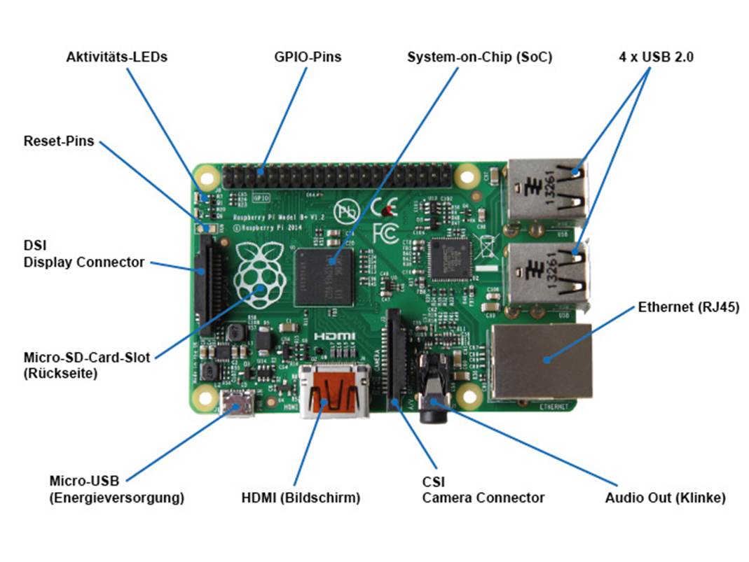 CSI-Kamera-Anschluss, DSI-Displayanschluss, integrierter Infrarot-Empfänger, Mikrofon-Eingang, 3,5-mm-Audioausgang |