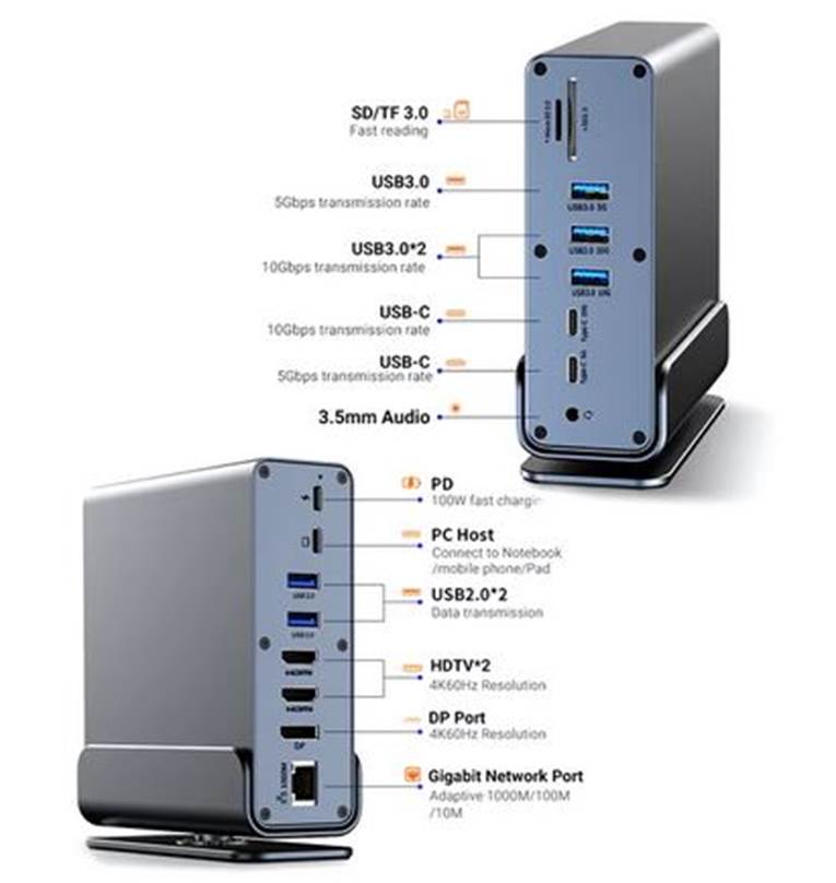 HDMI DP 4K HD Vertikal USB C Hub mit Triple Monitor,RJ45 1000m, USB 3.0/2.0,PD